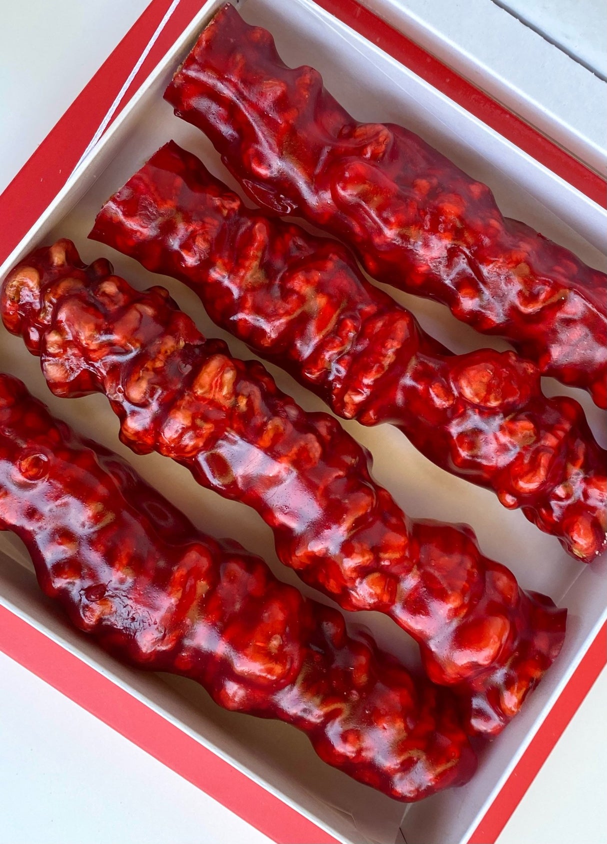 Ingrédients : Noix, mélasse de raisin, grenade, eau, sucre, sirop de glucose, amidon, farine de blé, régulateur d'acidité (acide citrique)