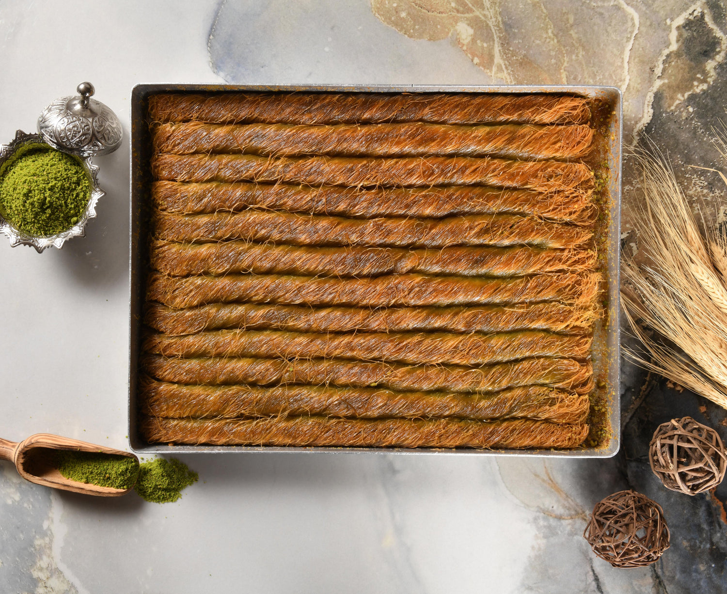 Les pistaches sont délicatement nichées dans des kadayifs en fil, versés avec soin pour former la forme exquise de l'Antep Burma Kadayif. Ce type spécial de burma kadayif, unique à Gaziantep, est fabriqué en l'enroulant habilement en un délicieux rouleau.