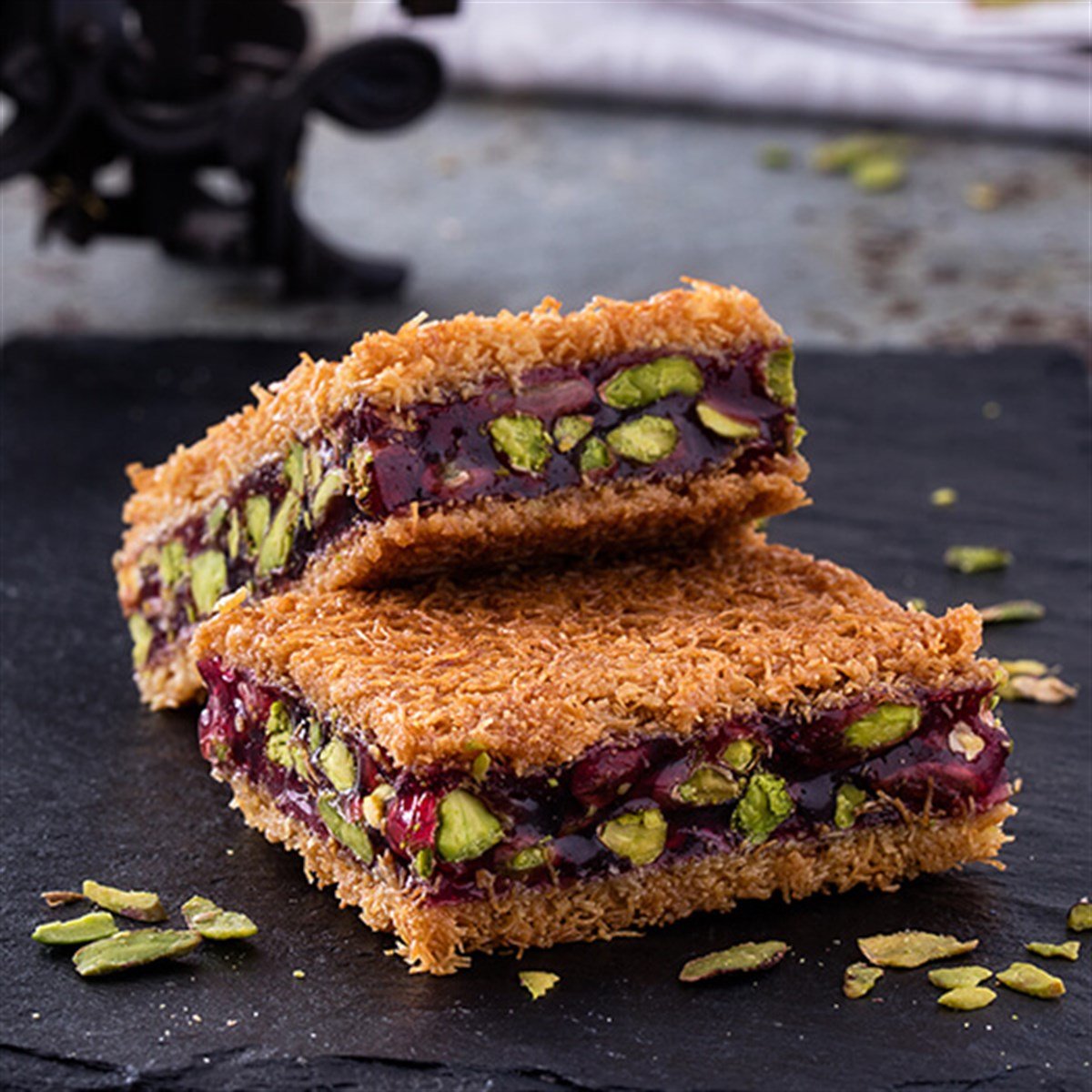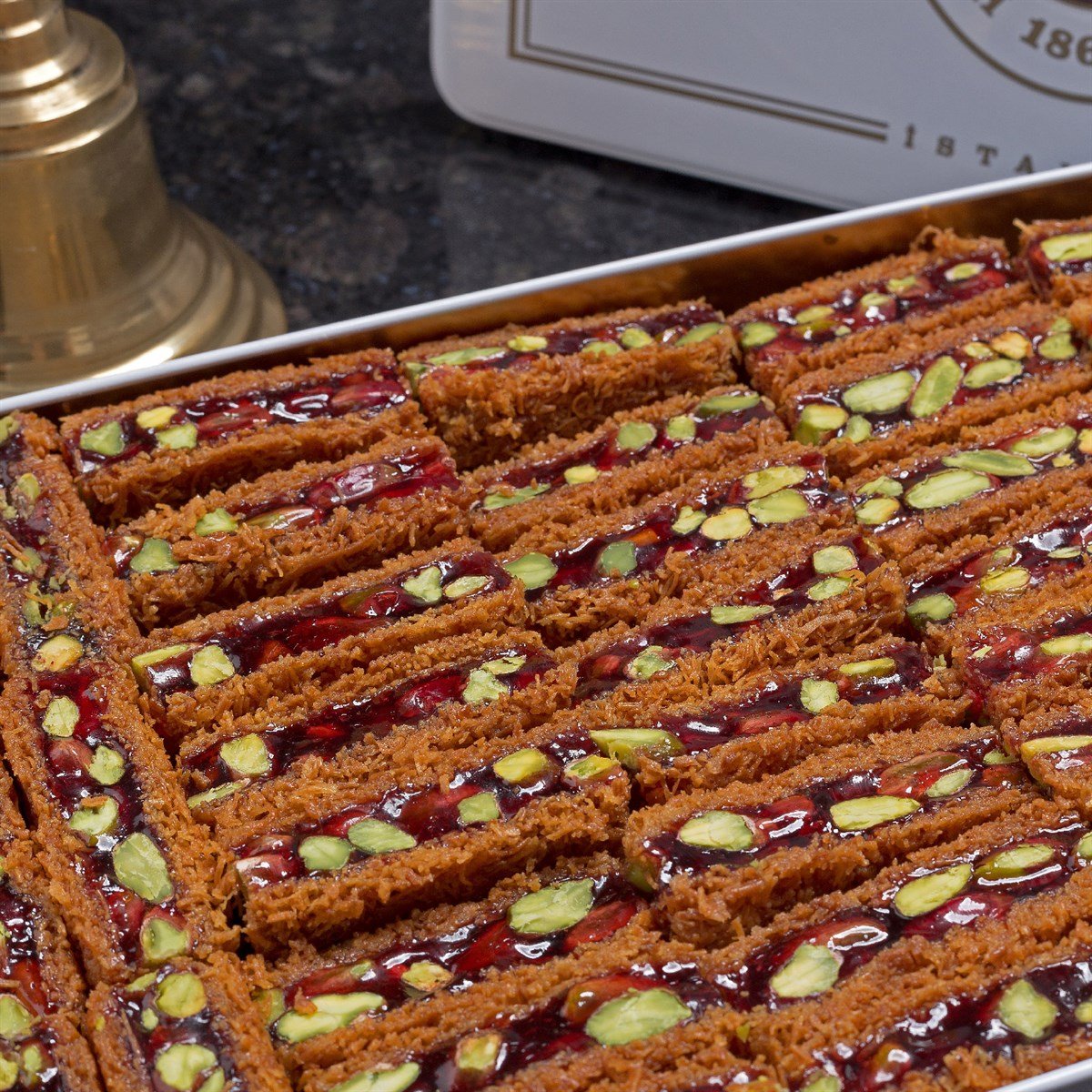 Le Kadayif ottoman avec grenade combine une délicatesse turque classique à la grenade avec des pistaches, qui est sandwichée entre deux couches de kadayif, faite de pâte feuilletée râpée. Ensemble, ils rassemblent les merveilleuses saveurs de la délicatesse turque et du kadayif dans un seul paquet délicieux.