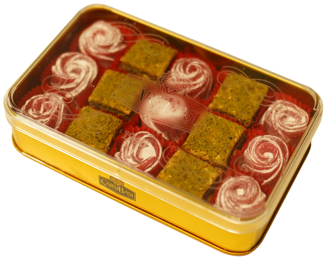 C'est l'assortiment classique ultime. La boîte réutilisable présente deux des variétés les plus appréciées : Antep Fistikli Pasta Lokum (loukoums riches, noix, enrobés de pistache) et Spesiyal Gül Lokum (loukoums délicats, parfumés, magnifiquement sculptés en forme de rose).