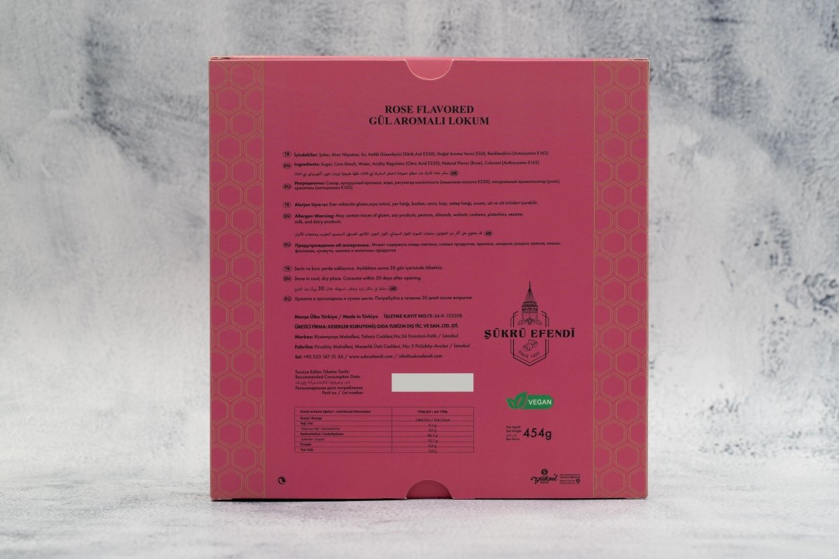 Découvrez le délice turc premium de Sukru Efendi, enfermé dans une élégante boîte carrée remplie de l'essence délicate de rose. Conçu pour répondre aux préférences de la nouvelle génération, cette friandise végétalienne de la gamme "Ouvrir et Déguster" offre un mélange délicieux de tradition et de modernité.